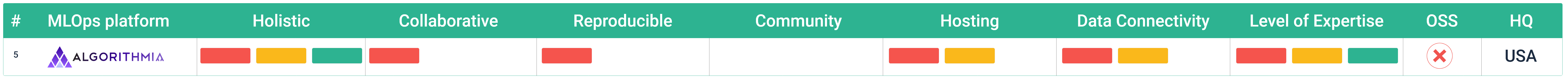 Level of expertise: We see it as increasingly important to have easy of use in general operability of a platform, as more newcomers enter the ML market. This last characteristic is more difficult to assess as it relates to many different aspects (UI/UX, workflow mechanics, help documents, general concepts, etc). This part is more open for discussion, but we tried to be as objective as possible. The rule: one bar for expert only, two bars for experts and advanced users and three bars for experts, advanced and beginners.